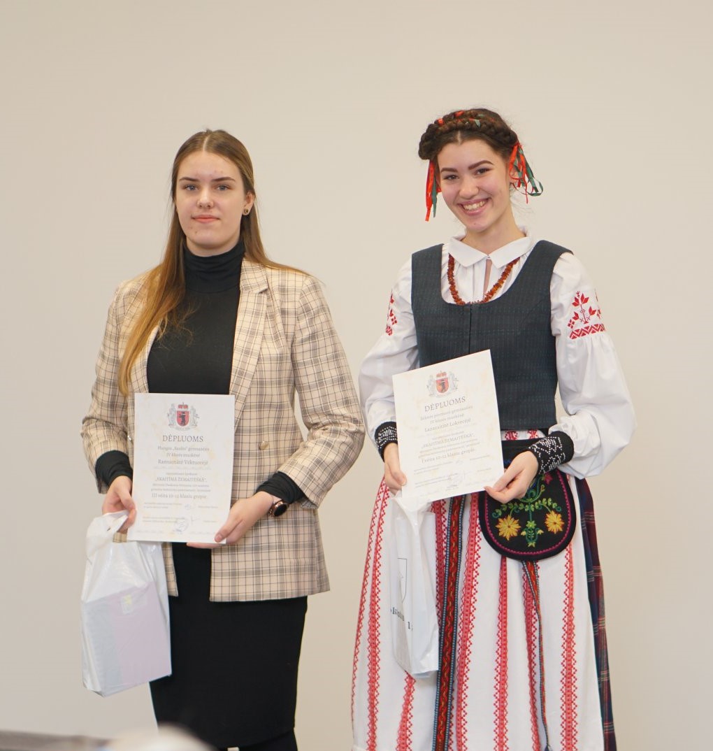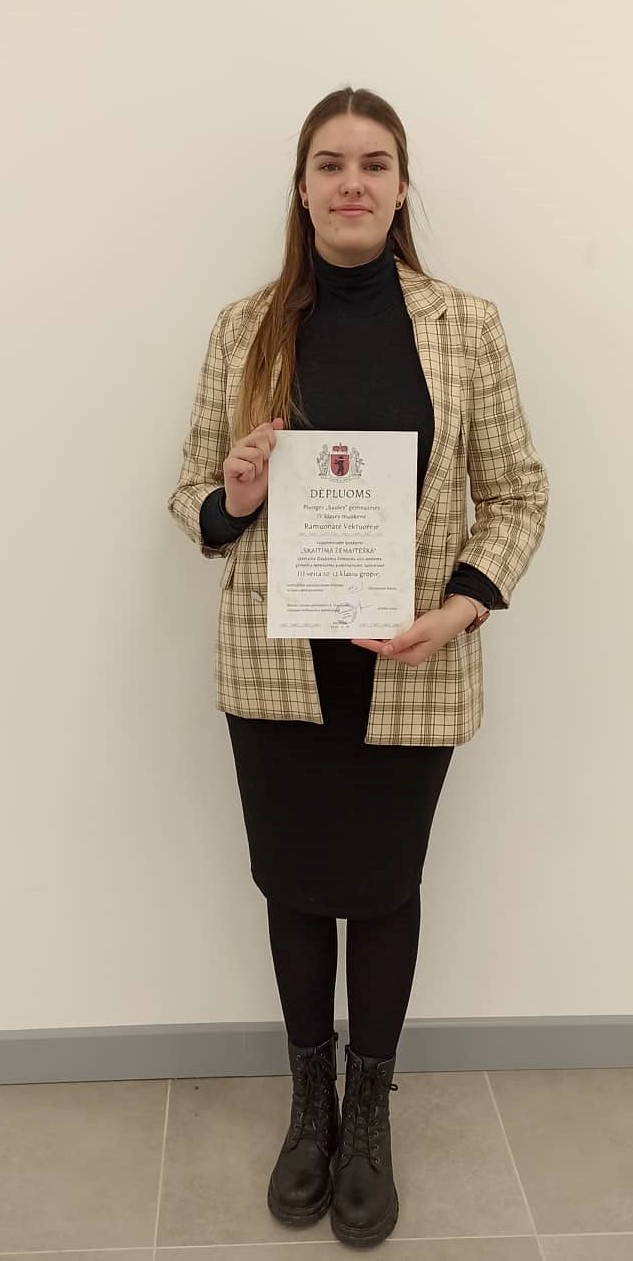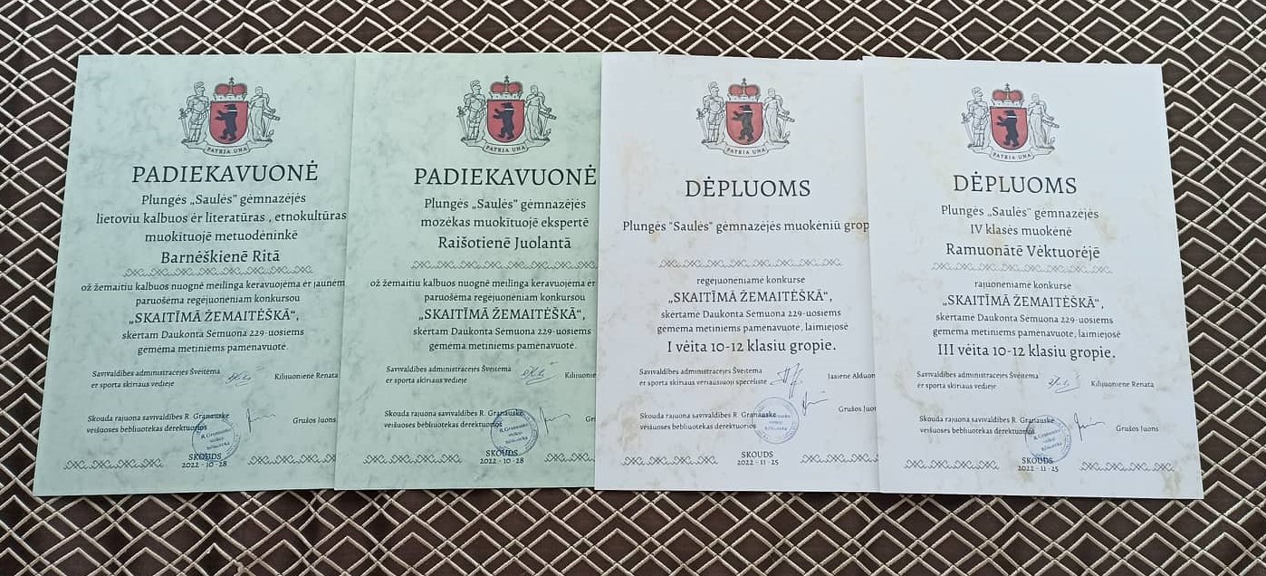 Džiugu, kad mūsų gimnazistai puoselėja žemaičių tarmę, puikiai ja kalba ir skaito, matyt, todėl ir konkurse juos lydėjo sėkmė. 10-12 klasių grupėje pagal S. Stripinienės tekstus parengtą pasakojimą „Baidymai“ skaičiusi Plungės „Saulės“ gimnazijos IV g klasės mokinė Viktorija Ramonaitė (mokinę ruošė lietuvių kalbos mokytoja metodininkė Rita Barniškienė) apdovanota regioninio konkurso 3 vietos diplomu ir specialiu komisijos prizu už taisyklingai, be kirčiavimo ir tarties klaidų skaitytą tekstą. Kompozicijų grupėje geriausiai pasirodė ir 1 vietą laimėjo Plungės „Saulės“ gimnazijos mokinių grupė: Aušra Zubytė, I c kl., Kamilė Daržinskytė, III b kl., Martyna Katkutė, III b kl., Emilija Pigagaitė, III b kl., Viktorija Ramonaitė, IV g kl. (mokines paruošė lietuvių kalbos mokytoja metodininkė Rita Barniškienė ir muzikos mokytoja ekspertė Jolanta Raišutienė). Merginos sužavėjo klausytojus ir komisiją poetine kompozicija „Žemaitynai“, pagal žemaičių poetų eiles.