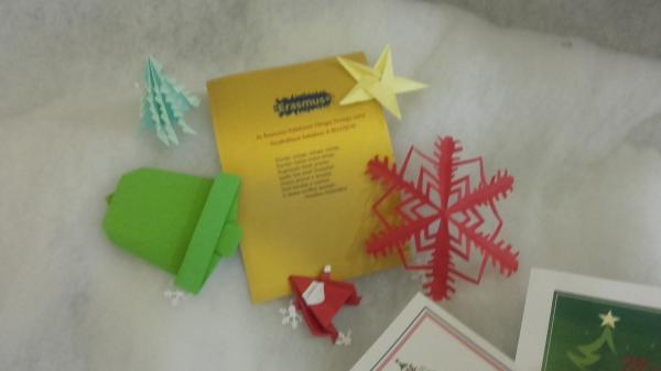 Visą lapkričio mėnesį gimnazistai savo matematinį kūrybiškumą taikė darydami origami darbelius. Nuostabūs kūrinėliai buvo išsiųsti į Belgijos, Bulgarijos, Italijos, Rumunijos ir Turkijos mokyklas. Visose mokyklose partnerėse buvo eksponuojamos analogiškos „Kalėdinio matematinio origami” parodėlės. Gimnazijoje darbelius išdėliojome gruodžio 17 dieną.